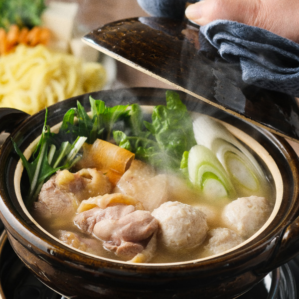 烏骨鶏をはじめ5品種の交配により生まれた大分のブランド地鶏「おおいた冠地どり」を、濃厚な鶏白湯スープ仕立ての鍋セットにしました。お好みの野菜を加え、お鍋を楽しんだ後は、〆のちゃんぽんで最後の一滴までスープをお楽しみください。