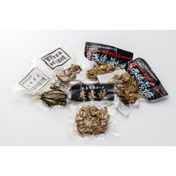| 九州産赤鶏の炭火焼95g×2、福岡県産玄海ポークの炭火焼80g、国産砂肝の炭火焼80g、国産手羽中の炭火焼80g |