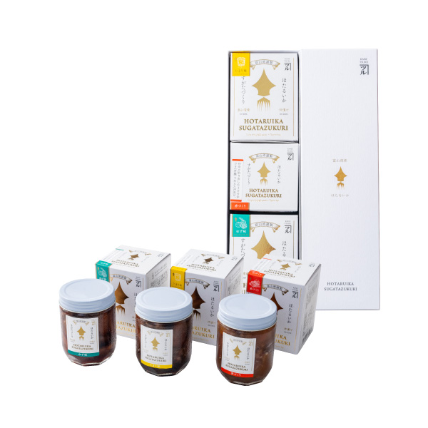 富山湾の春の使者、ほたるいか。ほたるいかのすがたはそのままに1匹ずつ丁寧に目玉を取り、醤油に漬けこみました。ワタのコクが楽しめる「赤づくり」、定番和風の「たまり味」、さわやかな香りの「ゆず味」、沖漬け人気トップ3が一度に味わえるお得なセットです。