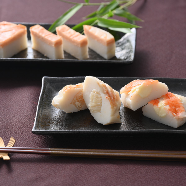 ほたて貝をかたどったかまぼこの中にオホーツク産の帆立貝柱がまるごと1個入った「ほたて」。2尾のえびがのった「えび」の中にはチーズが。鮭フレークをふんだんに使って表面を香ばしく焼き上げた「鮭」は、少し厚めにスライスして、わさび醤油やマヨネーズでどうぞ。大きめサイズで食べごたえ十分な3種の詰合せです。