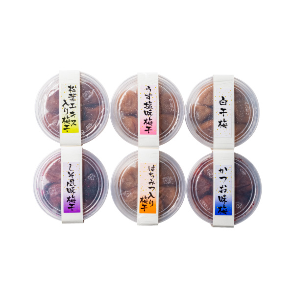 | 松葉エキス入り梅干(塩分約14%)・うす塩味梅干(塩分約6%)・白干梅(塩分約20%)・しそ風味梅干(塩分約8%)・はちみつ入り梅干(塩分約8%)・かつお味梅(塩分約14%) 各80g |