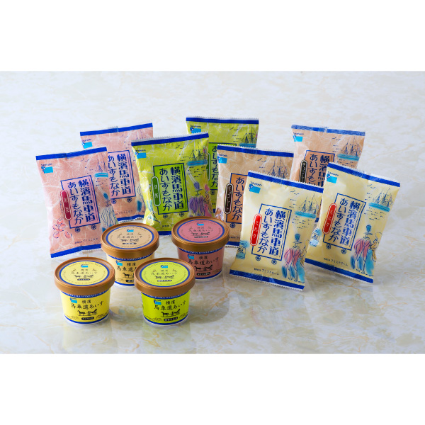 | 横濱馬車道あいすもなか65ml(ミルク・抹茶・小豆・チョコレート×各2個)、横濱馬車道あいす110ml(カスタード・渋皮栗・みるく大納言・緑茶みるく×各1個) |