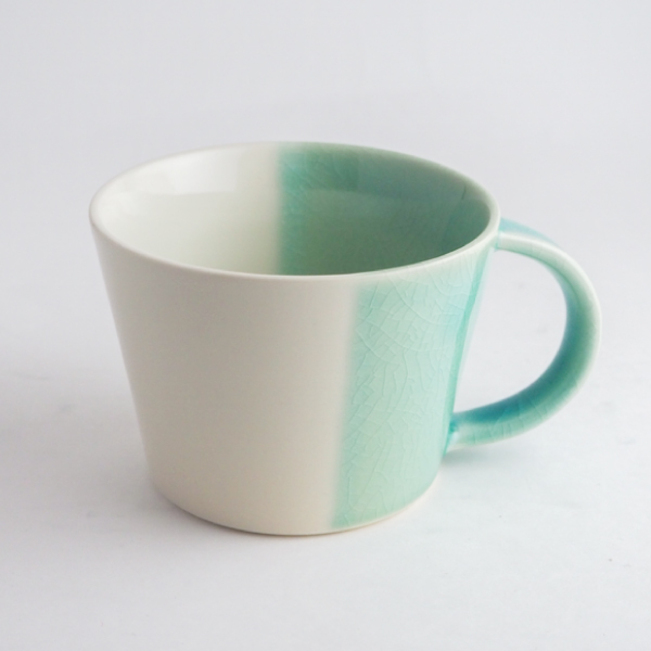 「黄彩」と「青磁」の2色のマグカップ。300mlと大容量ですが、軽量で持ち手も大きいので老若男女問わず喜んでいただけるマグカップです。