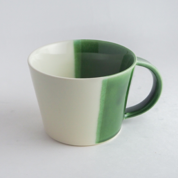「アメ」と「織部」の2色のマグカップ。300mlと大容量ですが、軽量で持ち手も大きいので老若男女問わず喜んでいただけるマグカップです。