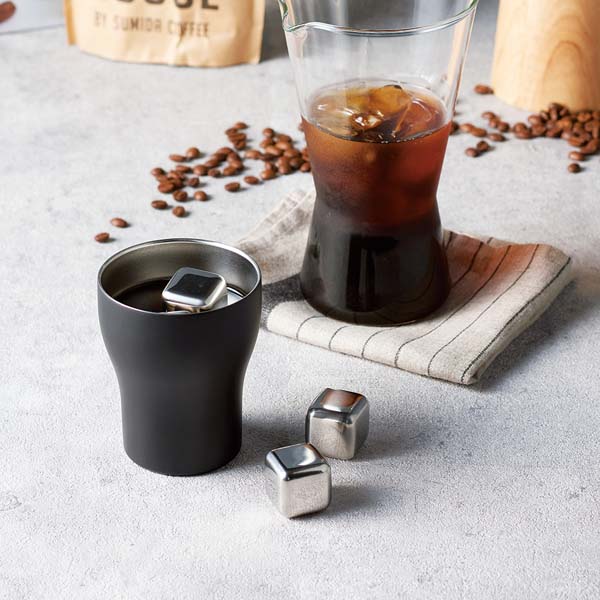 保温・保冷力に優れた二重構造ステンレスカップと、冷凍庫で冷やして氷の代わりとして使えるフローズンメタルのセット。氷のように溶けて飲み物を薄めることがないのでワインやビール、ジュースなどにもおすすめです。