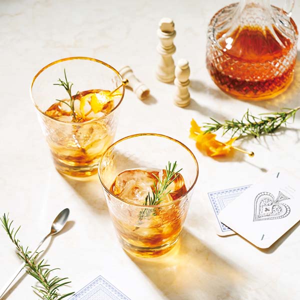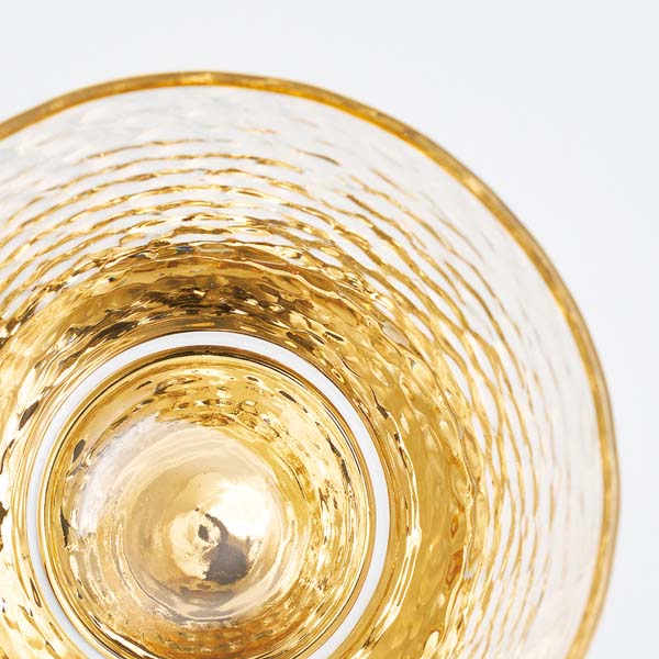 光を受けてキラキラと輝く美しいグラスに煌びやかな金色が反射して多彩な表情を見せるグラスが満ち足りた時間へ誘います。凸凹模様が美しいグラスの口元と底部に18Kゴールドを施すことで華やかな印象に仕上げました。