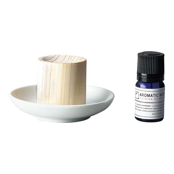| アロマディッシュ(幅4×奥行4×高さ4cm)、受け皿(直径8.5cm)、吉野ヒノキオイル5ml |