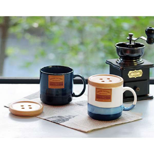 味わいのあるデニムの色味を再現したマグカップに、ボタンをかたどったナチュラルな雰囲気の木の蓋をセットにしました。小物入れとしても使えるアンティークな雰囲気の木箱付です。