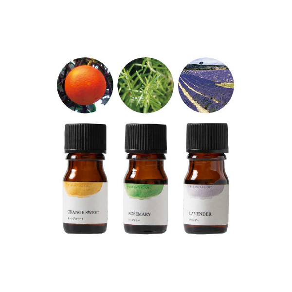 | オレンジスイート精油(各5ml)×1、ラベンダー精油(各5ml)×1、ローズマリー精油(各5ml)×1、アロマストーンスポット×1 |